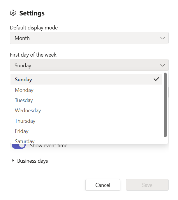Here you can personalize the view of your Calendar Pro: select one of the days within the 'First day of the week' drop down and click 'Save'.