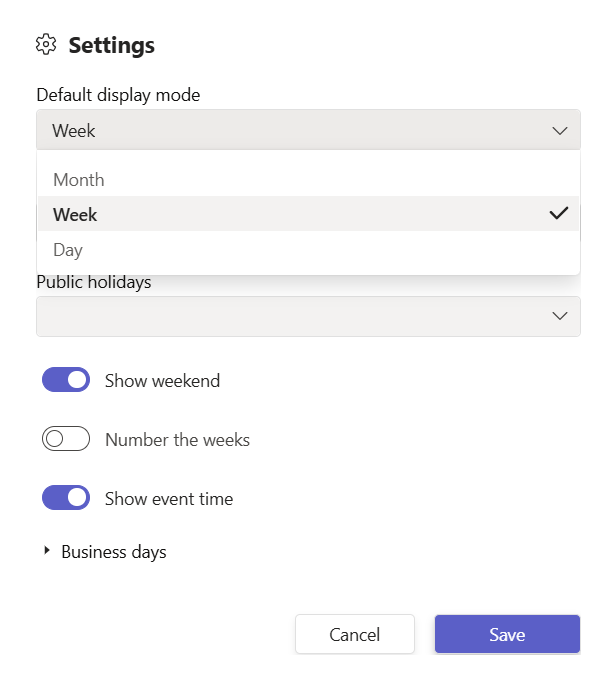 Here you can personalize the view of your Calendar Pro: select one of the options (Month, Week, Day) within the 'Default display mode' drop down and click 'Save'.