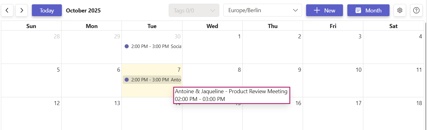 See the full meeting name at a glance, no extra clicks. When you hover your mouse over an event in the calendar, a small tooltip appears showing the complete title (even if itโs truncated on the grid).