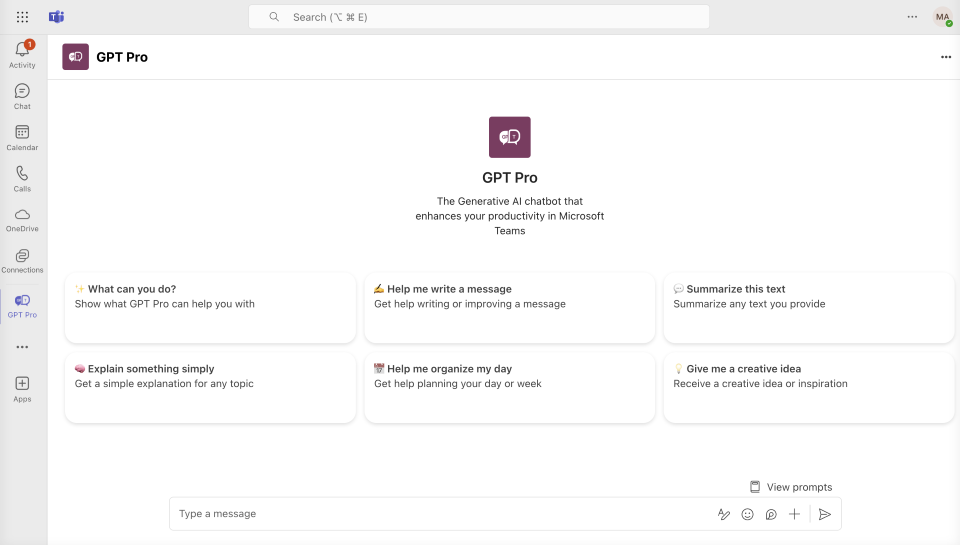 GPT Pro is a secure, AI-powered assistant available directly inside Microsoft Teams.