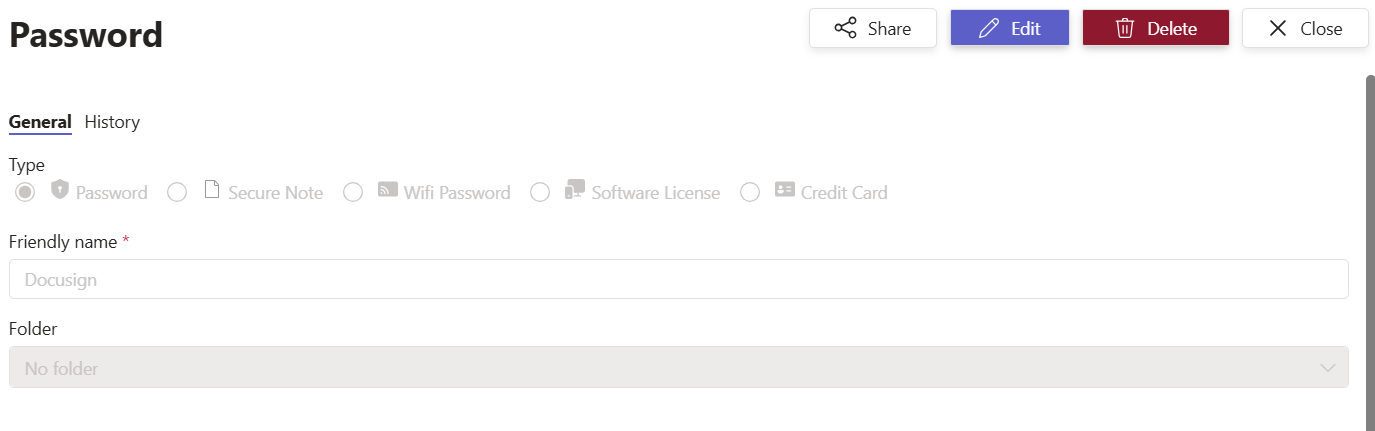 To quickly access your most important credentials, you can pin passwords at the top of your personal or shared vault. Click on the icon [π] at the top right of the password card. The pinned item will remain at the top of your vault for quick access.